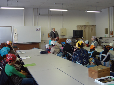 平成26年1月26日(日)に、滝沢農場にて小学生以上の児童とその保護者を対象とした「親子で楽しむみそ作り体験」を開催しました。当日は氷点下の寒さと雪の中、親子合わせて25名の皆さんが滝沢農場を訪れ、一家族ひと樽(約8.6kg)ずつ、みその仕込みを体験しました。最初に講義室でおおまかな手順を皆さんに説明しますが、お子さん達は楽しみで待ちきれない様子です。「材料の大豆、お米は滝沢農場で栽培・収穫されたものです」との説明に、保護者の皆さんも興味深そうに耳を傾けていました。