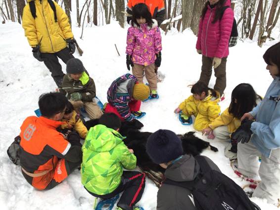 実演見学後はいよいよかんじき散策のスタートです。道中には広葉樹の幹に残されたシカの角研ぎ痕や雪上にできたウサギやキツネの足跡があり、実際に走り去るキツネを参加者全員で目撃できる瞬間もありました。また、用意していたクマ等の毛皮に触れてもらい、毛の柔らかさの違いを楽しみながら野生動物の質感を感じてもらいました。