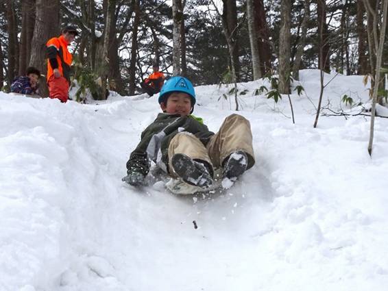 散策の最後は山の傾斜を利用した滑り台です。子供たちはかんじき散策の疲れも見せずに、何度も滑って楽しんでいました。
